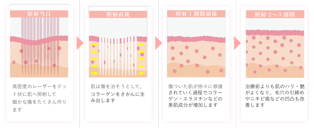 ヒーライトⅡは、創傷治癒を促す光治療器として開発された経緯があり、コラーゲン(弾力性のある繊維組織)・エラスチン(コラーゲンを束ね支えるタンパク質)の産生を促し、肌にツヤ・ハリを持たせます。さらに近赤外線が表情筋までとどいて、皮膚のたるみをひきしめます。加えてマクロファージ(防御機構を持った細胞で、侵入した細菌・老廃物・溜まったメラニンを食べ消化殺菌を行う)を活性化することで皮膚の免疫力を高め、肌の若返りに効果的です。